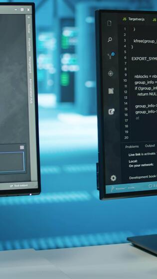 Vertical Computers in empty data center facility managing rackmounts energy consumption. Close up of script on PC monitors used for automation and monitoring processes in server room, camera A Pro Video