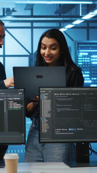 Vertical Programmer and supervisor in server room looking for equipment misconfigurations, doing brainstorming. Multiracial colleagues checking data center gear bottlenecks leading to glitches Pro Video