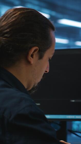 Vertical Computer scientist in server hub doing system analysis, coding, doing needed adjustments for supercomputers to run. Expert working in data center housing advanced storage infrastructure Pro Video
