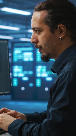 Vertical System administrator working in high tech server room capable of storing vast amounts of data, using computer. IT engineer typing on PC keyboard, upgrading servers controlling network resources Pro Video