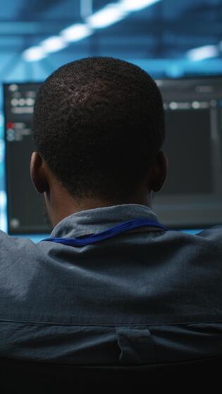 Vertical African american person with impairment in server farm ensuring data remains shielded from threats. Close up shot of wheelchair user safeguarding data center hardware against unauthorized access Pro Video