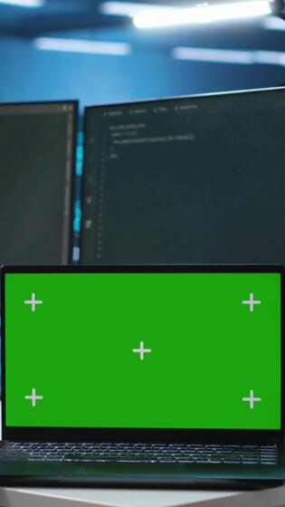 Vertical Isolated screen laptop next to programmer coding in server farm, ensuring valuable data remains shielded from threats. Worker safeguarding hardware against unauthorized access with chroma key notebook Pro Video