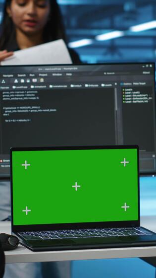 Vertical Manager in server hub supervising engineers looking for misconfiguration using isolated screen device. Woman coordinating experts mending data center bugs with mockup notebook, close up panning shot Pro Video
