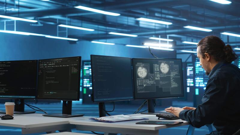 IT technician coding on computer in server farm establishment interrupted by virus attack, running to get help. IT support employee programming on PC rushing to check equipment after hacking attack Pro Video