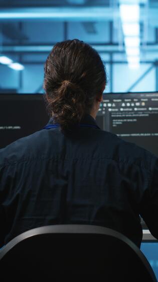Vertical Engineer drinking coffee and programming in server room with equipment storing datasets. Employee enjoying caffeine beverage, typing code on PC to mend data center racks doing computational operations Pro Video