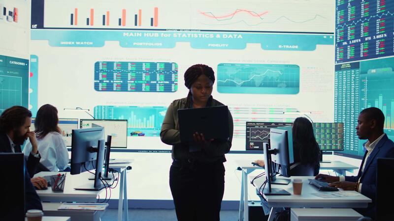 Business analyst looking into statistics and reports to detect any obstacles within the project structure, preparing solutions to ensure productivity. Manager studies numbers. Camera B. Pro Video