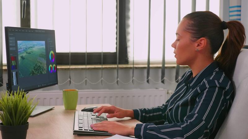 Freelancer hispanic videographer editing new project working in modern company creating content. Entrepreneur in professional workspace writing on computer keyboard looking at desktop Pro Video