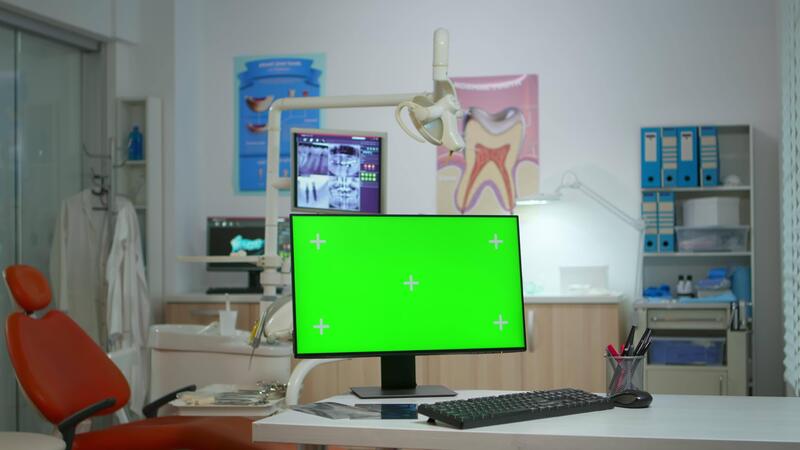 Computer with green screen placed in front of camera in empty modern equipped stomatological room. Stomatology clinic with nobody in it prepared for next patient with mock-up, chroma key pc display Pro Video