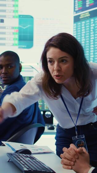 Vertical Irritated angry team leader screaming at her coworker after he failed to calculate expenditures, showing her disappointment in front of everyone. Furious dissatisfied business manager. Camera B. Pro Video
