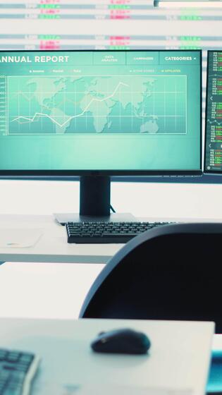 Vertical Empty work cubicles inside the enterprise headquarters office, business organization dealing with project planning and global expansion. Big data presented on a screen in coworking space. Camera A. Pro Video
