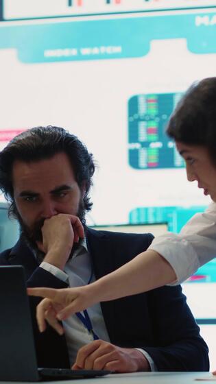 Vertical Business associate presents daily tasks order to enterprise administrator, discussing about funding and resources allocation in order to expand globally. Company analysts collaborate. Camera A. Pro Video