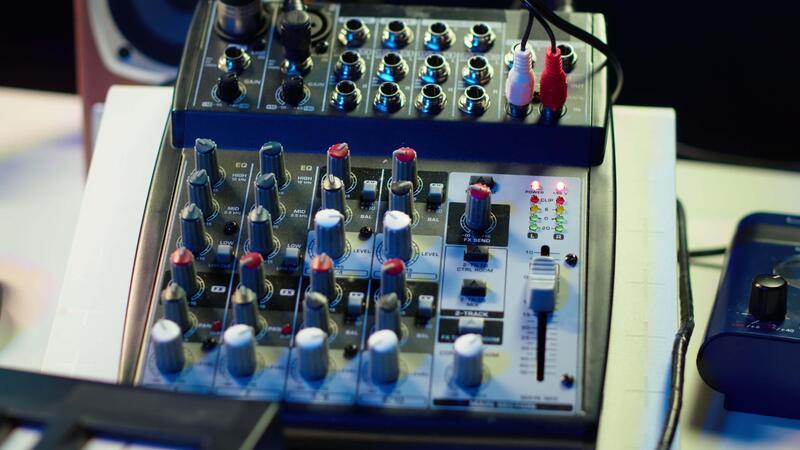 Empty home studio desk with motorized faders and pre amp knobs used with a mixing console and equalizer to produce music. Modern space with amplifier and devices for mix and master. Pro Video