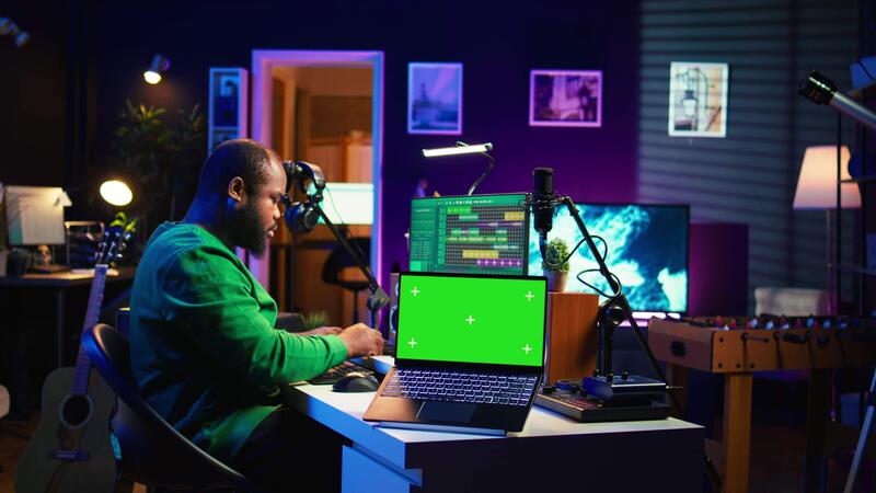 Producer editing his audio files and recordings on digital pc interface, sitting next to an isolated mockup screen. Sound engineer mixing and mastering songs with console in home studio. Camera B. Pro Video
