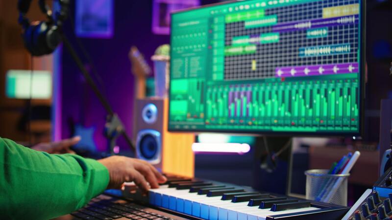 African american audio technician using piano synthesizer keys to add sound effects in post production, editing tunes with digital software and mixing console. Male artist in home studio. Camera B. Pro Video