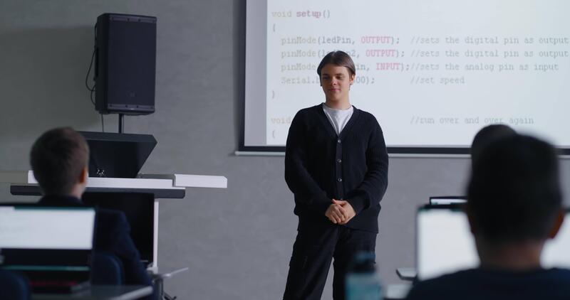 Smart Boy Student Speaking In Classroom And Talking With Classmates, Programming Classes In School Pro Video