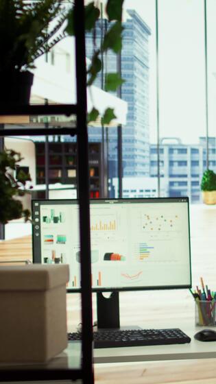 Vertical High end company office with a computer showing detailed data insights, executive business meetings or financial planning in a boardroom. Project development in a modern workspace. Pro Video