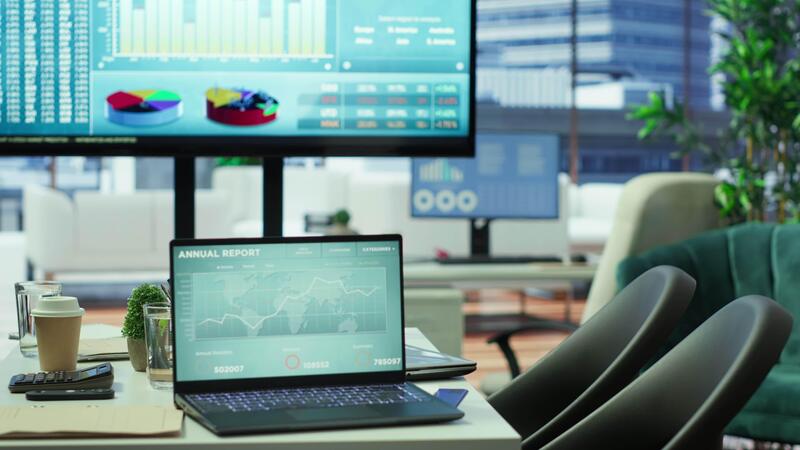 In a professional boardroom, computer screen showcases business data and statistics, aiding executives in strategy planning. Empty office space for meeting to help with workflow optimization. Pro Video