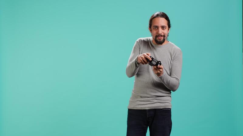 Cheerful player happy after winning gaming console game, shaking fist, studio background. Portrait of man satisfied after being victorious in videogame, defeating all enemies using gamepad, camera A Pro Video