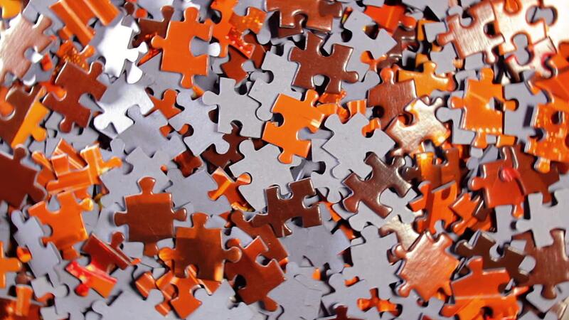 Background of Colored Puzzle Pieces that Rotating Counterclockwise - Top View. Texture of Incomplete Red and Grey Jigsaw Puzzle - Left Rotation Pro Video