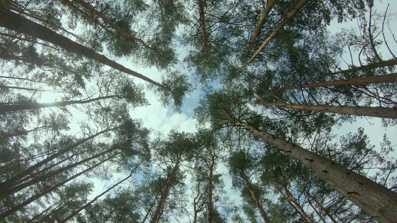 Low Angle View of a Pine Forest when Looking Up to the Trees. Bottom View of Pine Crowns at Sunny Summer Day. The Sky Can Be Seen Through the Tops of the Trees. Forward Gimbal Stabilizer Movement Pro Video
