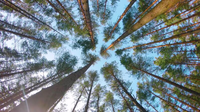 Low Angle View of Colorful Summer Pine Forest, Walking Through the Coniferous Trees - Moving Right. Bottom View of the Tops of Pines at Sunny Summer Day. The Sky Can Be Seen Through the Tops of Pines Pro Video