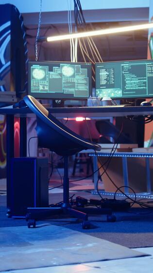 Vertical High tech computer system running malicious code in empty basement, handheld camera shot. PC monitors in empty neon lit criminal hideout used by hackers to commit illegal activities, camera A Pro Video