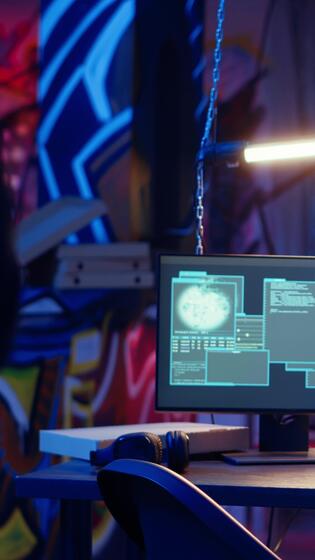 Vertical Hacker arriving with tablet in hidden base, deploying viruses on unaware victims computers, stealing sensitive and private information, selling it on darknet black market to highest bidder, camera B Pro Video