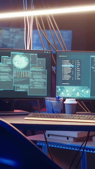 Vertical Hacker arriving in underground base, ready to do computer sabotage using encryption trojan ransomware. Cybercriminal starting hacking process, ransoming stolen data from victims, camera B Pro Video