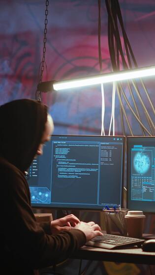 Vertical Hacker arrives in messy base of operations with neon lights and graffiti drawings sprayed on walls. Cybercriminal using ghetto hideout as HQ to commit illegal activities using computer, camera B Pro Video
