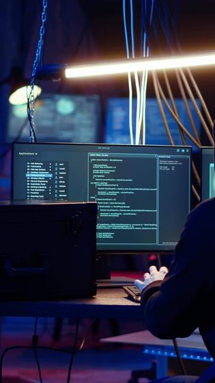 Vertical Hacker leaving secret base with SSD in briefcase containing data obtained from victim after tricking it into installing ransomware program. Man exiting base of operations with suitcase, camera B Pro Video