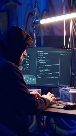 Vertical Hacker uses PC to target vulnerable unpatched connections, seeking to compromise digital devices and steal valuable sensitive data. Rogue programmer finds exploits for system vulnerabilities, camera B Pro Video