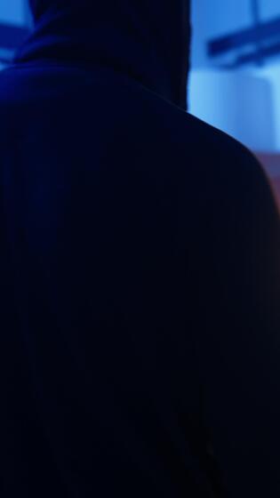 Vertical Hacker arriving in underground base, ready to do computer sabotage using encryption trojan ransomware. Cybercriminal starting hacking process, ransoming stolen data from victims, camera A Pro Video