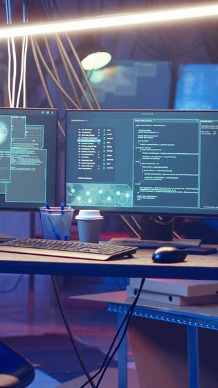 Vertical High tech computer system running malicious code in empty basement, handheld camera shot. PC monitors in empty neon lit criminal hideout used by hackers to commit illegal activities, camera B Pro Video