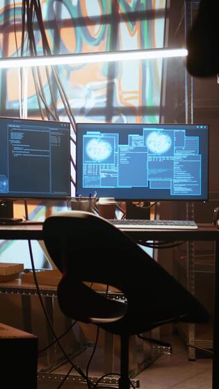Vertical Hacker arrives in messy base of operations with neon lights and graffiti drawings sprayed on walls. Cybercriminal using ghetto hideout as HQ to commit illegal activities using computer, camera A Pro Video