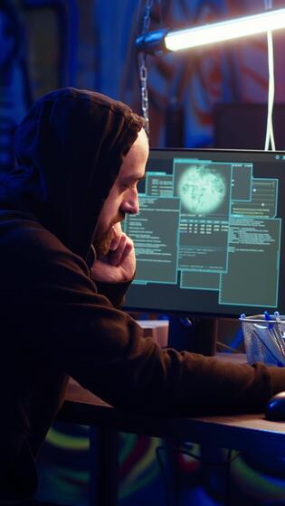 Vertical Malicious man hacking and talking on phone with partner, stealing credit card numbers, manipulating banking systems. Evil hacker runs dangerous code, chatting with friend in telephone call, camera B Pro Video
