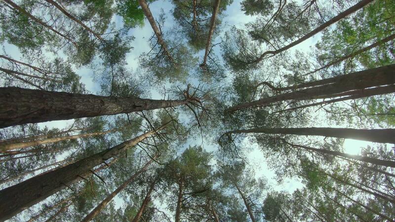 Low Angle View of a Pine Forest when Looking Up to the Trees. Bottom View of Pine Crowns at Sunny Summer Day. The Sky Can Be Seen Through the Tops of the Trees. Backward Gimbal Stabilizer Movement Pro Video