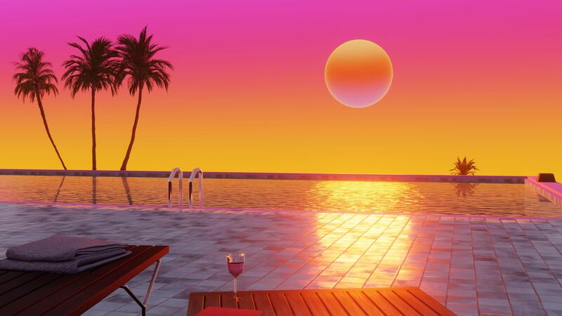 Private swimming pool with Palm trees at sunset time. 3d Synthwave animated background. Seamless loop. Pro Video