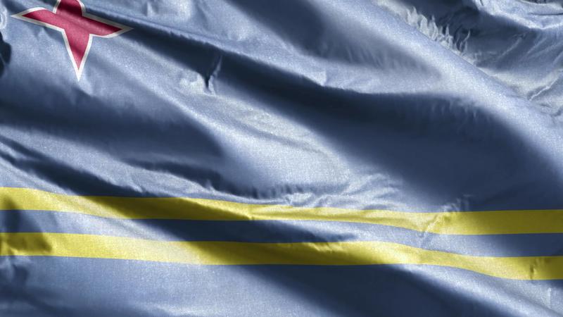 Aruba textile flag slow waving on the wind loop. Aruba banner smoothly swaying on the breeze. Fabric textile tissue. Full filling background. 20 seconds loop. Pro Video