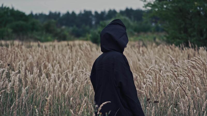 Dark ghost on a wheat field. Back view of a spooky figure in black cloak turning its scary face on camera on the nature background. Pro Video