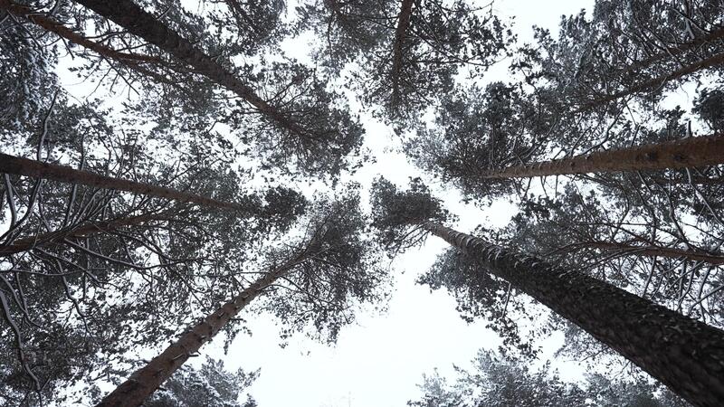 Dizzying view of winter trees. Media. Beautiful view from below of tree crowns in winter forest. Beautiful rotating view of treetops in winter Pro Video