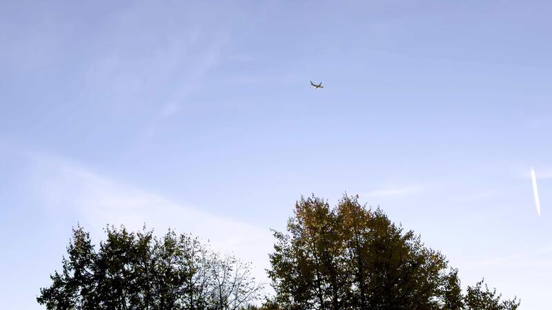 An airplane cruising through a clear, blue sky on a bright autumn day. The minimalist scene captures the serenity of open air and high-altitude travel, with a few soft, wispy clouds adding gentle Free Video
