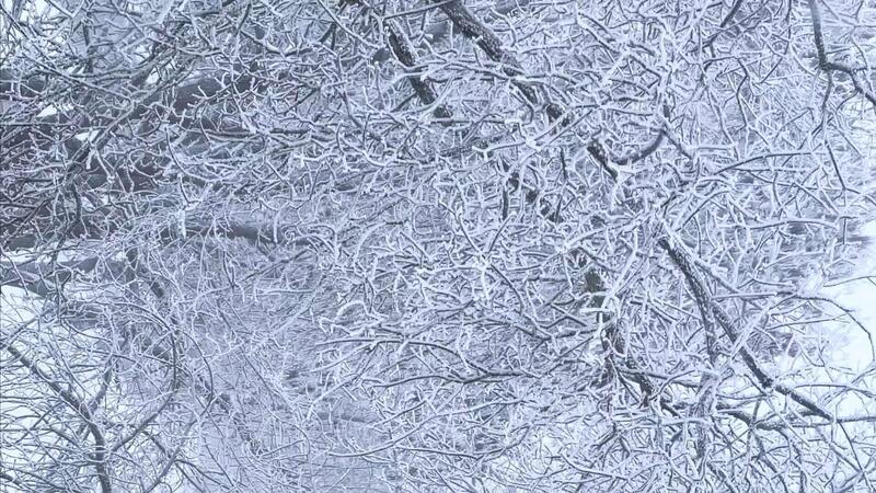 Winter background of tree branches covered with frost and swaying in the wind. Vertical Pro Video