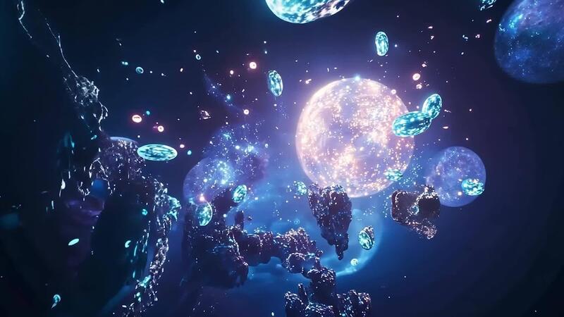 A mysterious scene in outer space showcasing floating blue glowing crystals and rocks in a cosmic landscape, with a luminous planet adding to the surreal beauty of this distant, uncharted space realm Free Video