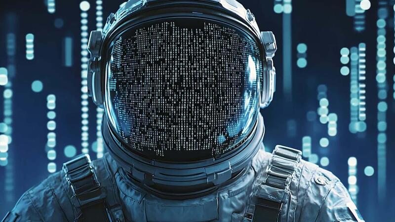 A close-up of an astronaut's face inside a futuristic space helmet, with the helmet reflecting numerous digital numbers, symbolizing the concept of space exploration and technology in a future world Free Video