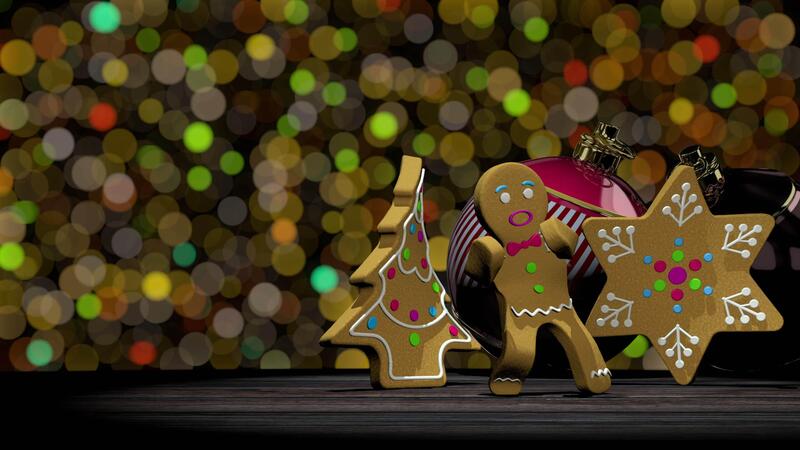 Dancing gingerbread man next to gingerbread cookies in tree and star shape on wooden table against defocused lights background. Loop sequence. 3D animation Pro Video