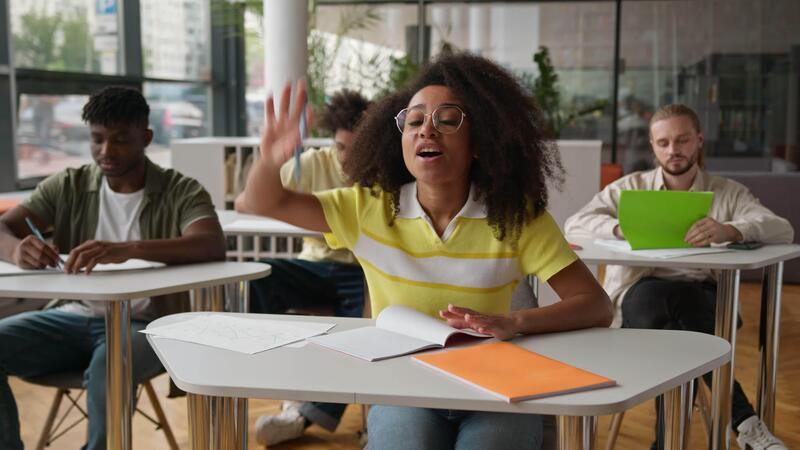 Class lesson in school university college lecture classmates sitting in classroom African American woman girl student female ask teacher problem discuss talking to tutor difficulty task studying learn Pro Video