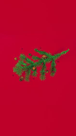 Stop motion animation of New Year's Tree Branch with Cones, minimal New Year, Christmas vertical banner on red background Pro Video