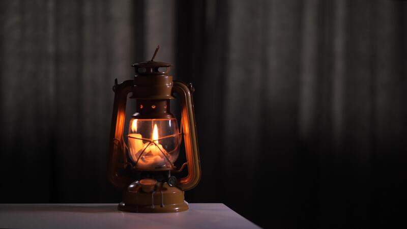 Old, burning kerosene lamp standing on white table illuminating dark room with out-of-focus curtains in the background, creating cozy and nostalgic atmosphere Pro Video