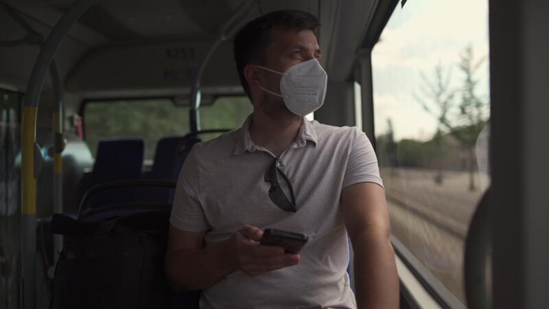 Commuting during pandemic. Public transportation curfew. Using cell phone while commuting to work on public transportation bus while wearing mask to prevent corona virus. Social distancing on bus Pro Video