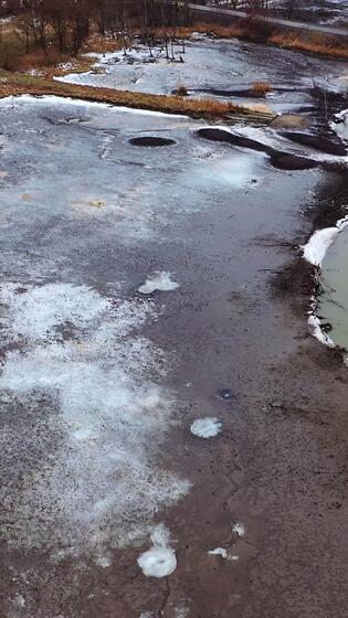 Nature in danger. Gloomy background of a river and fields in spring. Environmental problems. Aerial flight. Vertical Pro Video